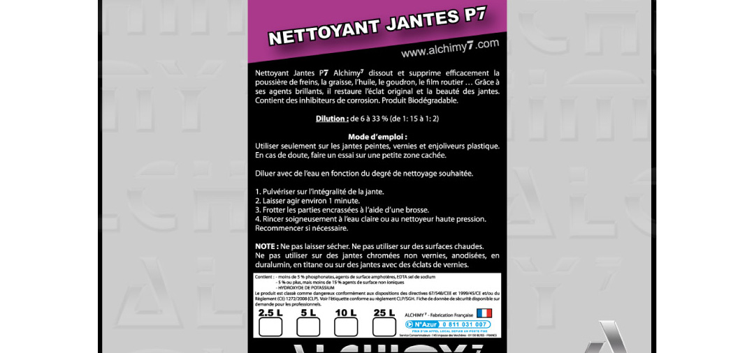Enfin, le Alchimy7 nettoyant jantes P7 contient également des agents brillants et des inhibiteurs de corrosion.